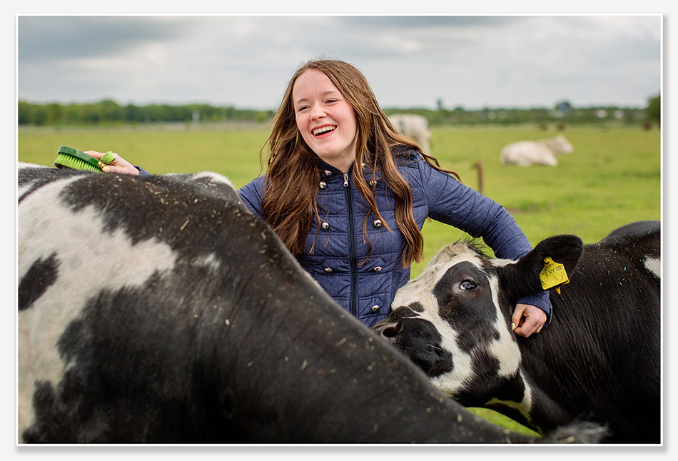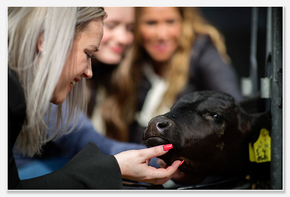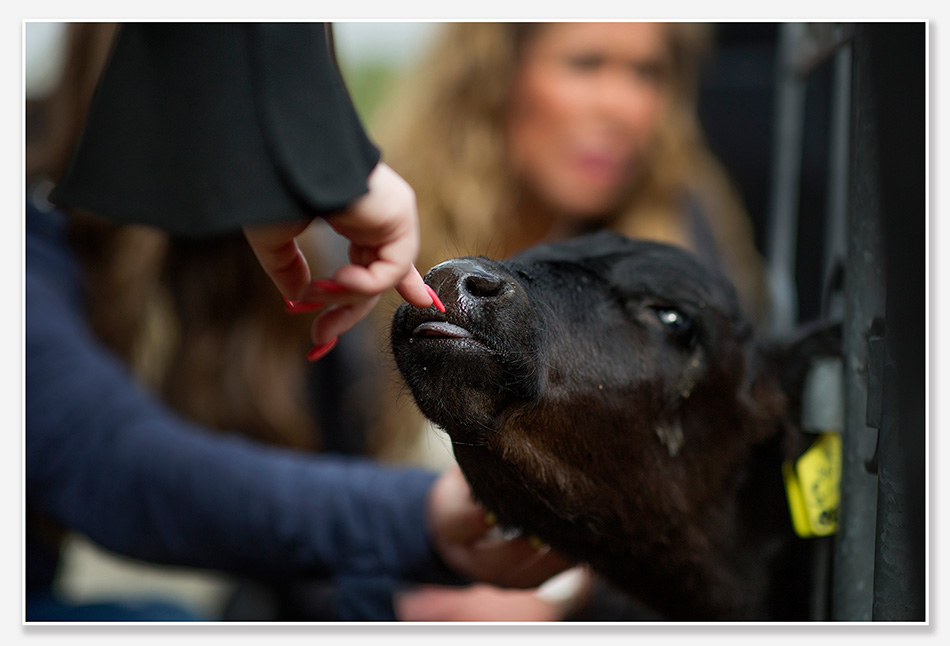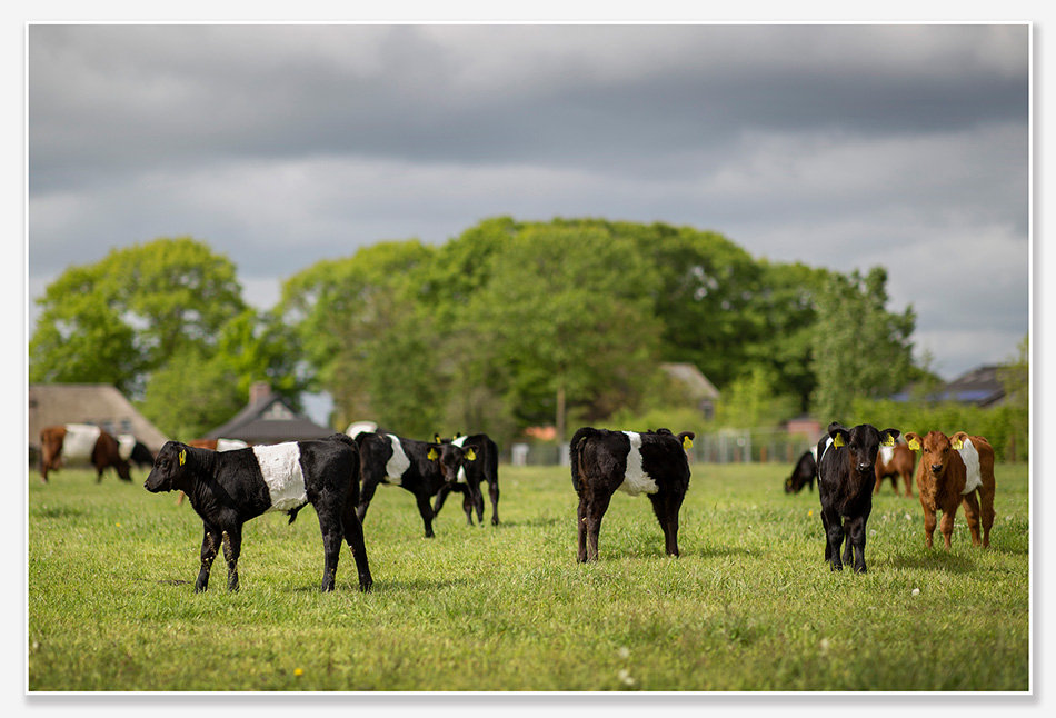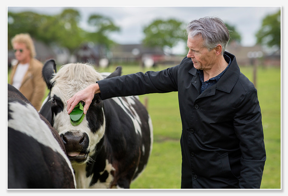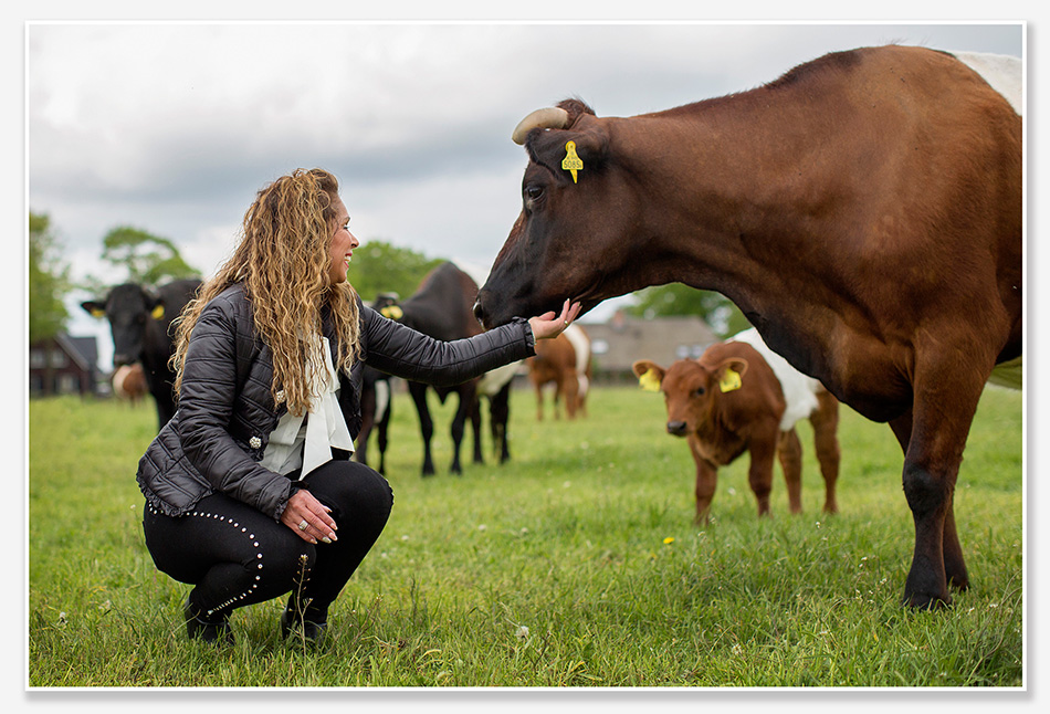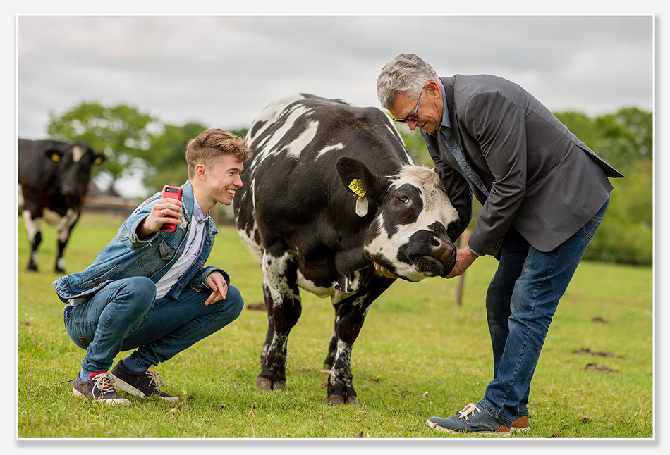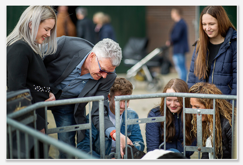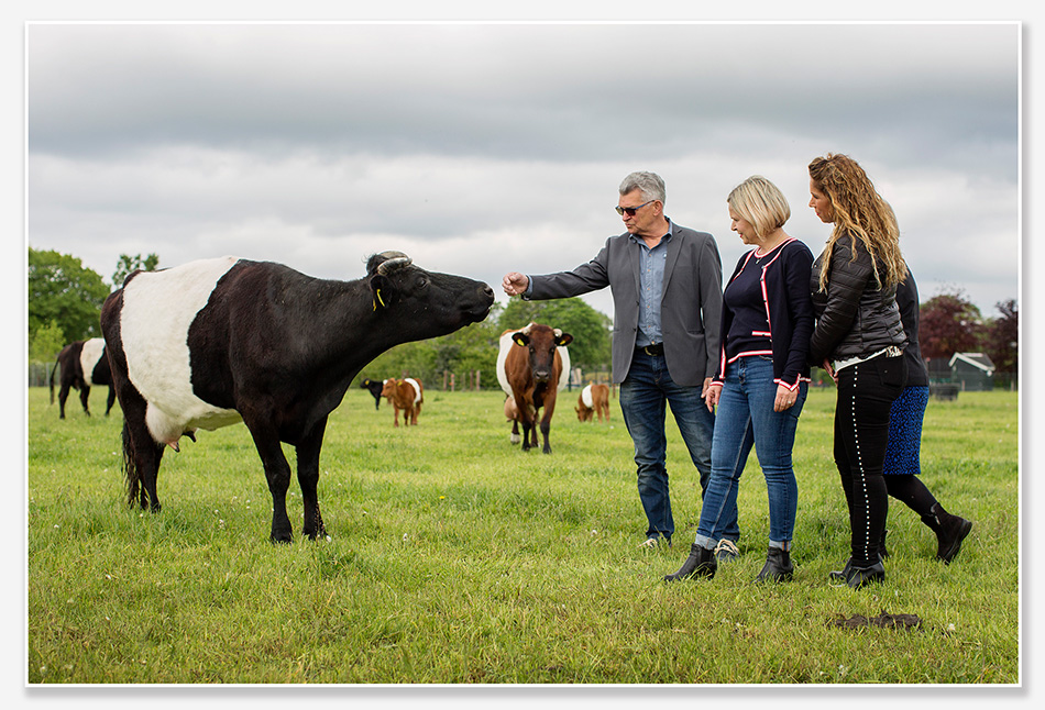 Wat bij aankomst op de boerderij het eerste opviel was een grote groep Lakenvelder moederkoeien vergezeld door hun kalfjes, samen in één grote wei. Wat een prachtig gezicht, zo iets kom je niet meer veel tegen. Het gouden bruidspaar mocht met zijn twee dochters even proberen contact te maken met de Lakenvelders, maar terwijl de moederkoeien best even wilden komen snuffelen, waren de kalfjes wat schuwer. Dus dan maar met de hele familie naar de wei met de Belgisch Witblauw koeien. Het hek was nauwelijks open en deze 1000 kilo dieren kwamen gelijk een kijkje nemen. Ja hoor, geborsteld worden en knuffelen dat wilden ze wel! Natuurlijk werden er ook veel selfies gemaakt, gingen ook de stoerste mannen mee knuffelen en werd aan het einde nog gedacht aan de kalfjes die minder geluk hebben gehad en die daardoor zonder moeder dicht bij de boerderij opgroeien.