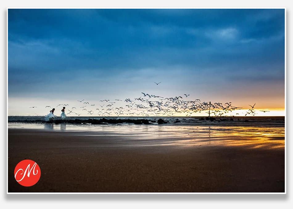 Hoe kan ik dit fantastische jaar nou beter afronden dan met een Award bij de Masters of Dutch Wedding Photography. Wat een eer! Dat de strandbruiloft van Sanne en Helena, bij welke deze foto genomen is, een bijzonder plekje in mijn hart heeft, had ik bij de sneak preview al laten blijken. Dat nu ook nog eens een foto uit deze trouwreportage dusdanig door de gerenommeerde collega’s uit de jury gewaardeerd word, maakt 2015 voor mij helemaal compleet! Ik moet daarbij zeggen dat ik tijdens het fotograferen van deze foto al besefte dat ik een bijzonder moment te pakken had! Er was die dag slecht weer voorspelt geweest, maar uiteindelijk hadden we niets te klagen – het was een bedekte maar droge dag geworden. Tijdens het feest bij Beachclub Millers Beach bij Kijkduin echter begon de zon ineens toch nog tussen de wolken uit te gluren. Het leek erop dat we nog een mooie zonsondergang zouden krijgen. Naarmate het water zich verder terug trok vormde zich kort voor het strand een rotsheuvel waar massa’s meeuwen vertoefden. Voor de grap zei ik tegen Sanne en Helena dat het een mooie foto zou geven als ze daar op zouden gaan staan – ik zag het helemaal voor me ook zou dat inhouden dat ze daarvoor een stukje moesten zwemmen. Gelukkig was dat uiteindelijk niet echt nodig, want toen we voor het laatste stukje zonsondergang het strand opkwamen, had het water zich nog verder terug getrokken en gaf een pad naar dat eilandje vrij. Terwijl de twee bruiden langs de waterkant slenterden lag ik in het zand heel wat foto’s te maken. Toen Sanne en Helena bij het rotspad waren aangekomen pakten ze de zoom van hun jurken op en renden op de meeuwen af. Ik zag hoe die scene zich voor mijn lens ontvouwde en schoot eigenlijk een beetje vol – zo volmaakt zag het er voor mij uit.